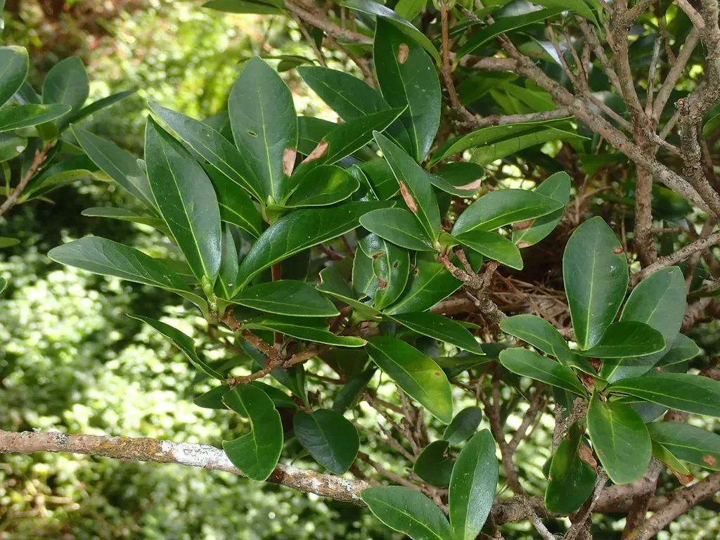 Picconia azorica is an evergreen shrub or small tree native to the Azores, characterized by smooth pale bark and leathery leaves.