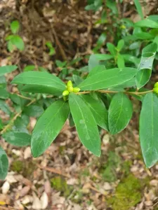 Pimelea drupacea is a shrub native to Australia, known for its attractive clusters of white to pale cream tube-shaped flowers and elliptic leaves arranged in opposite pairs.