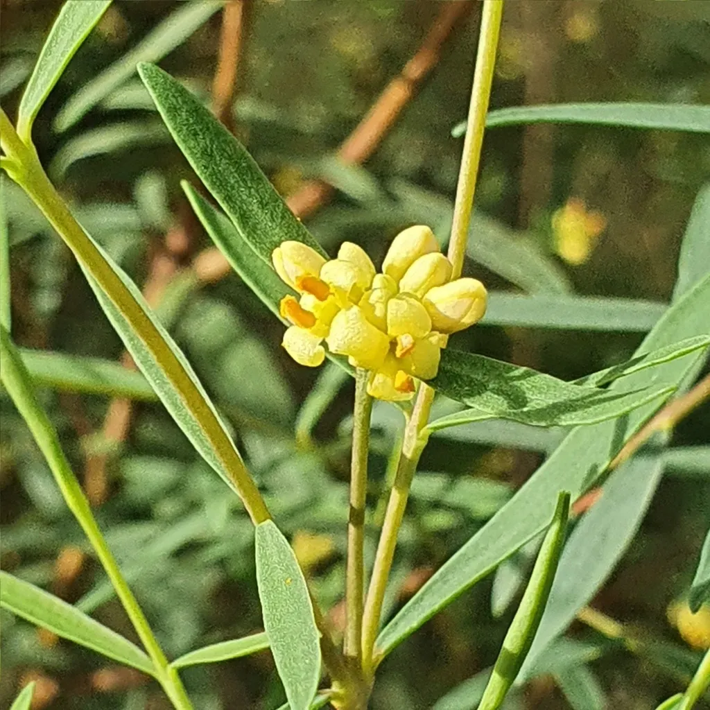 An erect, dioecious shrub with narrow blue-green foliage and clusters of small yellow flowers.