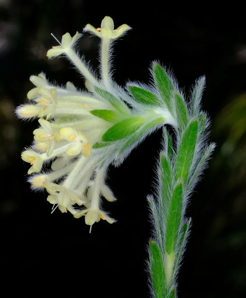 Pimelea octophylla is an erect shrub native to southern Australia, characterized by densely hairy young stems, narrowly elliptic leaves, and cream to pale yellow flowers.