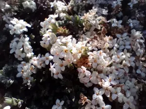 Mountain Loving Daphne (Pimelea Oreophila) is a perennial shrub in the Thymelaeaceae family with moderate care difficulty. It requires moderate watering and full sun or partial shade light in USDA hardiness zones 8-11. This plant is toxic to cats and dogs — keep it out of reach of pets.