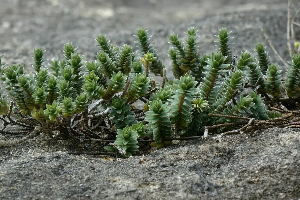Pimelea villosa is a sprawling, low-growing shrub native to New Zealand’s coastal sand dunes, recognized for its hairy branches and pointed leaves.