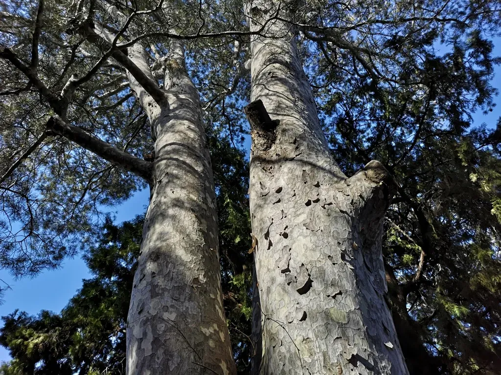 Pinus bungeana is a slow-growing evergreen conifer known for its distinctive exfoliating bark that reveals a mosaic of white, olive, purple, and silver patches.