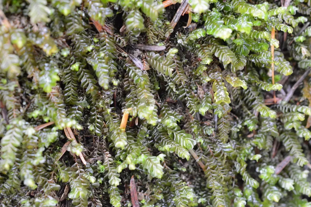 Plagiochila porelloides is a medium-sized liverwort with a typical Plagiochila appearance, thriving in shaded, humid environments often found on rocks, logs, and stream banks.
