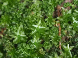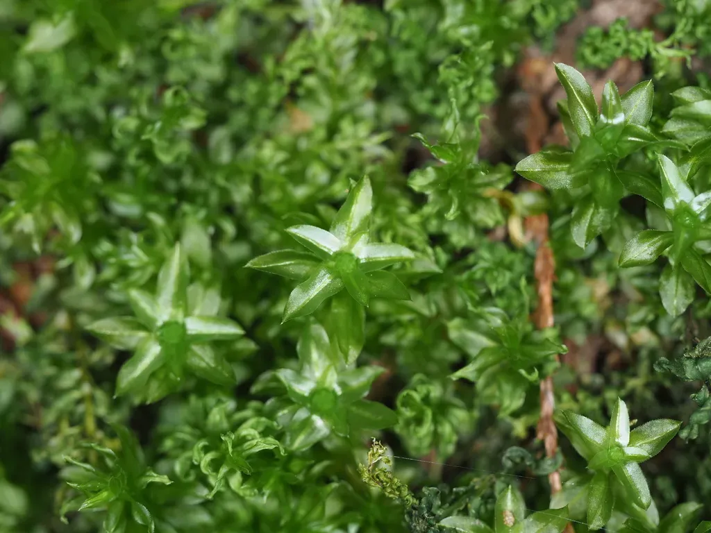 A large leafy moss species known as badge moss, forming loose, tall green turfs up to 8 cm tall.