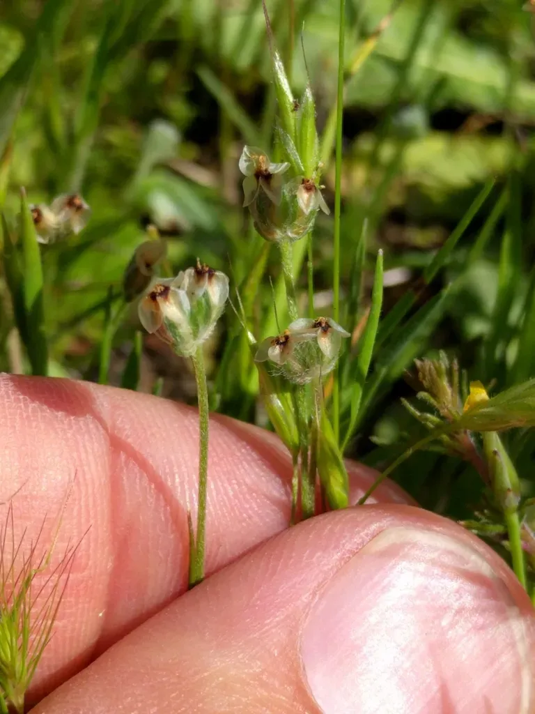 Plantago erecta is a small annual herb native to western North America, characterized by narrow, grass-like leaves and small clustered flowers on a stalk.