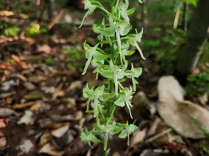 Platanthera orbiculata is a perennial orchid native to northern North America, known for its distinctive round, glossy leaves and fragrant greenish-white flowers.