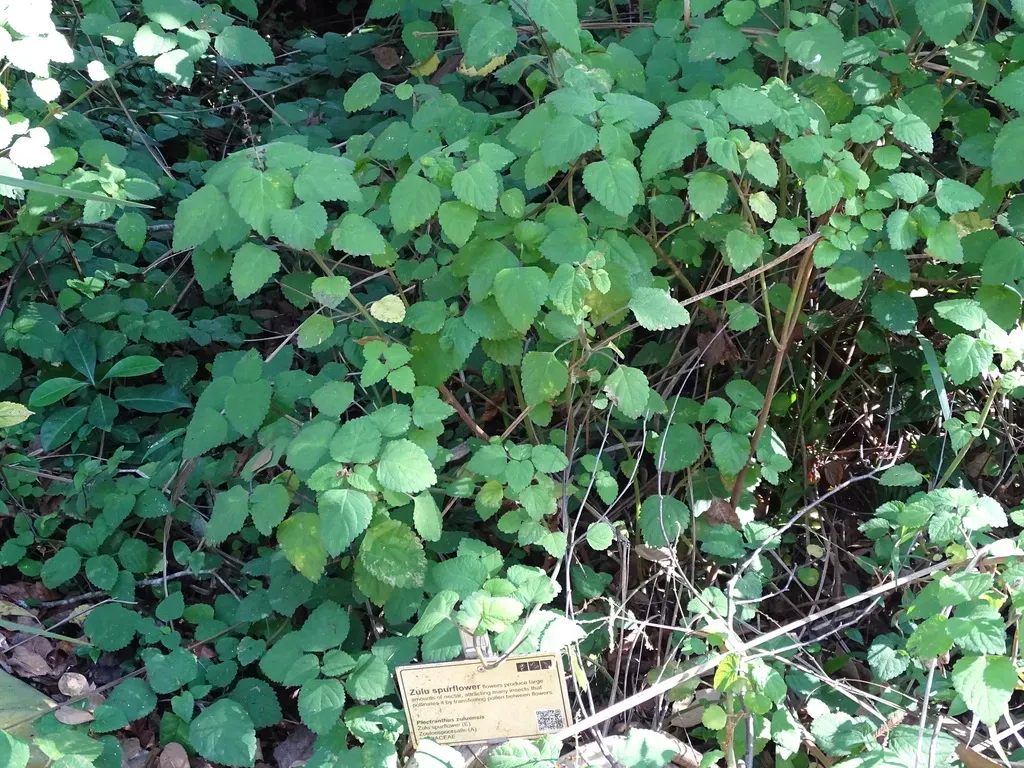 Plectranthus zuluensis is an erect or sprawling, soft shrub up to 2 m high with hairy, velvety stems and ovate, coarsely-toothed lime-green leaves.