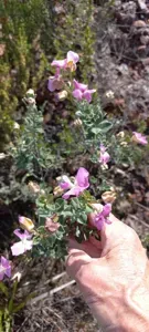 Podalyria myrtillifolia is a small shrub known for its silvery, silky leaves and delicate pink to mauve pea-like flowers.