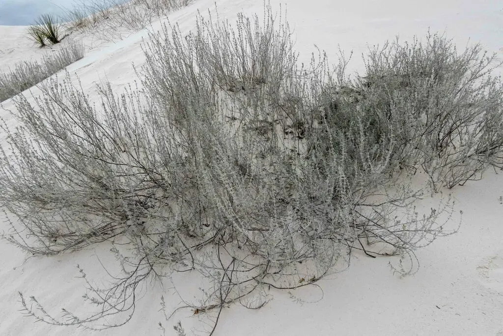 A 2 to 3.5 ft aromatic perennial shrub with small narrow deciduous leaves and small axillary flowers, covered with short white hairs giving a frosted appearance.
