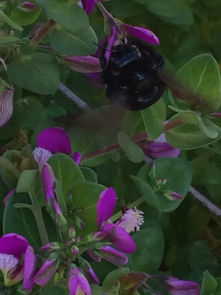 An evergreen shrub with vibrant purple-magenta, pea-like flowers and compact, gray-green foliage.