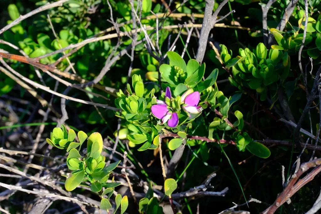 Polygala myrtifolia is an evergreen shrub or small tree native to South Africa, known for its narrow leaves and abundant pink-purple flowers.