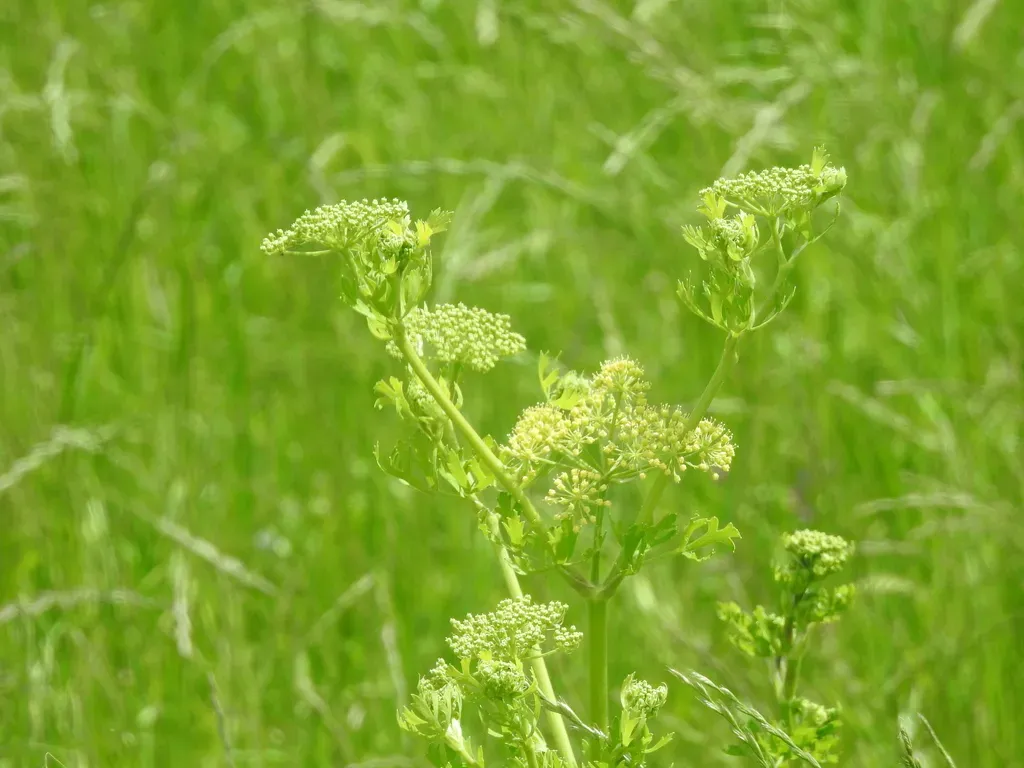 Polytaenia texana, commonly known as Texas prairie parsley, is a biennial flowering plant native to Texas and Oklahoma, characterized by its parsley-like leaves and small clustered flowers.