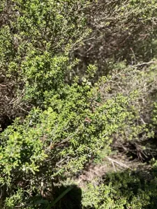 Pomaderris amoena is a small shrub up to 1 meter tall with hairy twigs, narrow wrinkled leaves, and clusters of white flowers.
