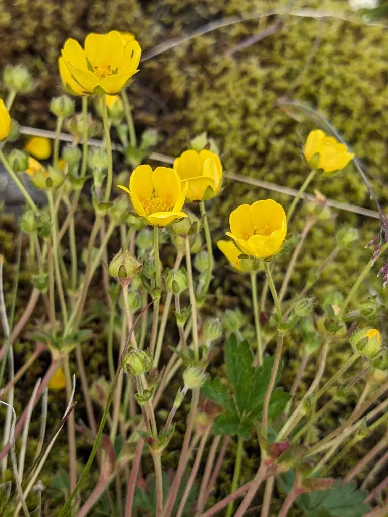 Potentilla crantzii is a perennial herbaceous plant known for its bright yellow flowers with distinctive orange markings and palmate basal leaves.