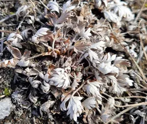 Potentilla nivea is a perennial herbaceous plant known for its dense tufted growth and trifoliate basal leaves, often partially hidden by blackish-brown leaf remains.