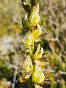 Prasophyllum elatum is a tall terrestrial orchid native to Australia, known for its erect stem and numerous pale yellowish flowers.