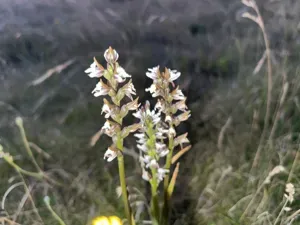 Prasophyllum suttonii is a terrestrial orchid endemic to southeastern Australia, characterized by a single tube-shaped leaf and up to 35 white flowers with purple or mauve markings.