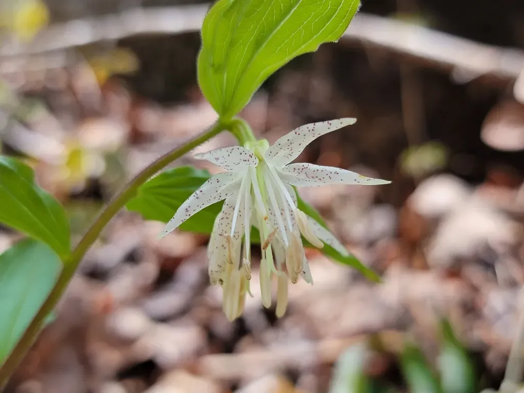 Prosartes maculata is a perennial herbaceous plant native to rich deciduous forests in the Appalachian region, known for its bell-shaped, creamy white to yellowish flowers with purple spots.