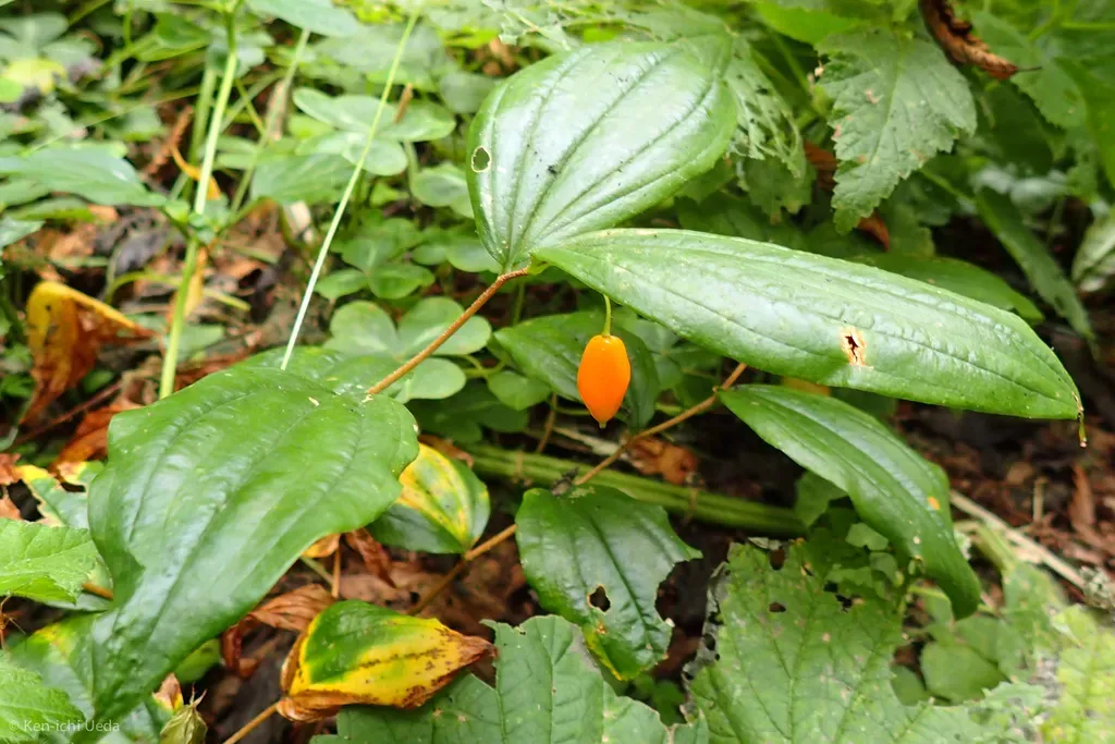 Prosartes smithii is an erect, branching perennial herb with narrow, fuzzy stems and wide, oval-shaped pointed leaves.
