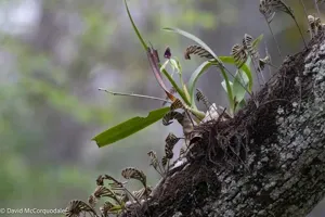 Prosthechea cochleata is an epiphytic orchid native to Central America, known for its distinctive shell-shaped flowers.