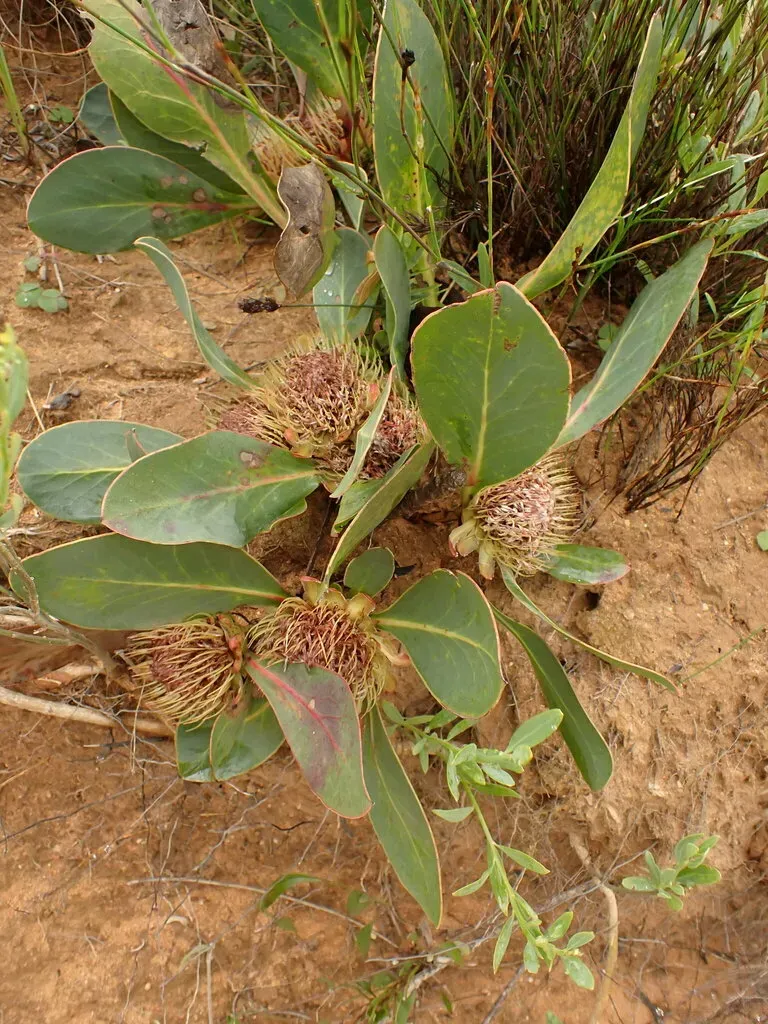 Common Ground Sugarbush (Protea Acaulos) is a perennial shrub in the Proteaceae family with moderate care difficulty. It requires moderate watering and full sun or partial shade light in USDA hardiness zones 9-11. This plant is safe for cats and dogs.