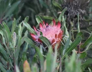 Protea susannae is a broadleaf evergreen shrub native to the southwestern Cape Region of South Africa, known for its pink to red flowers that bloom mainly from winter to spring.