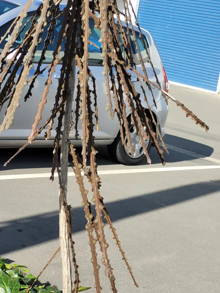 Fierce Lancewood (Pseudopanax Ferox) is a perennial tree in the Araliaceae family with moderate care difficulty. It requires moderate watering and full sun or partial shade or dappled_shade light in USDA hardiness zones 8-11. This plant is safe for cats and dogs.