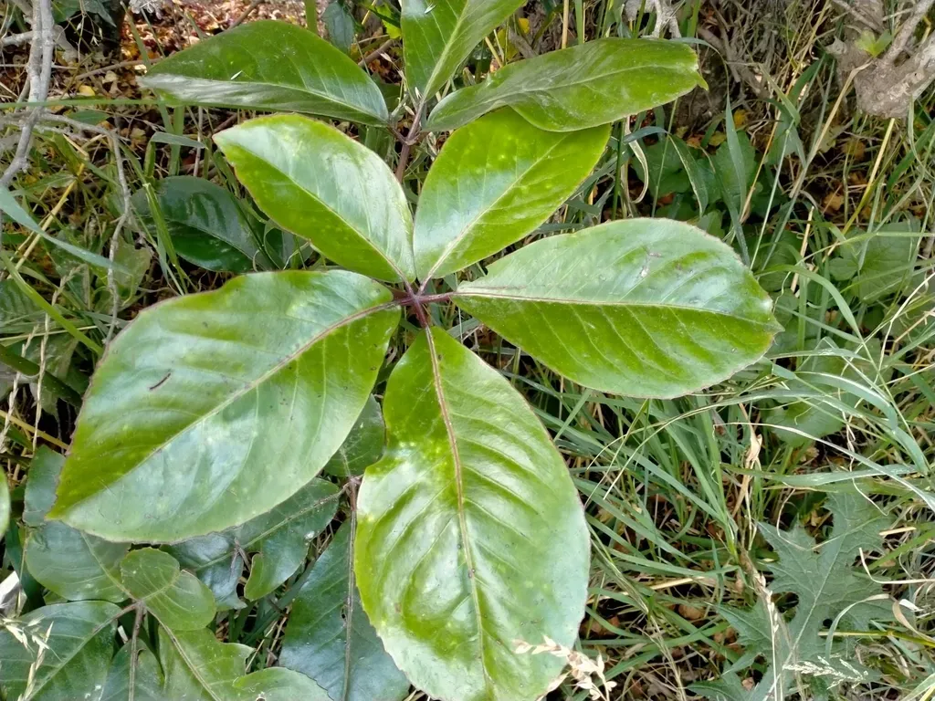 Pseudopanax laetus is a large, evergreen shrub or small tree native to the North Island of New Zealand, known for its distinctive palmate leaves composed of five to seven leaflets and small cream-colored flowers.