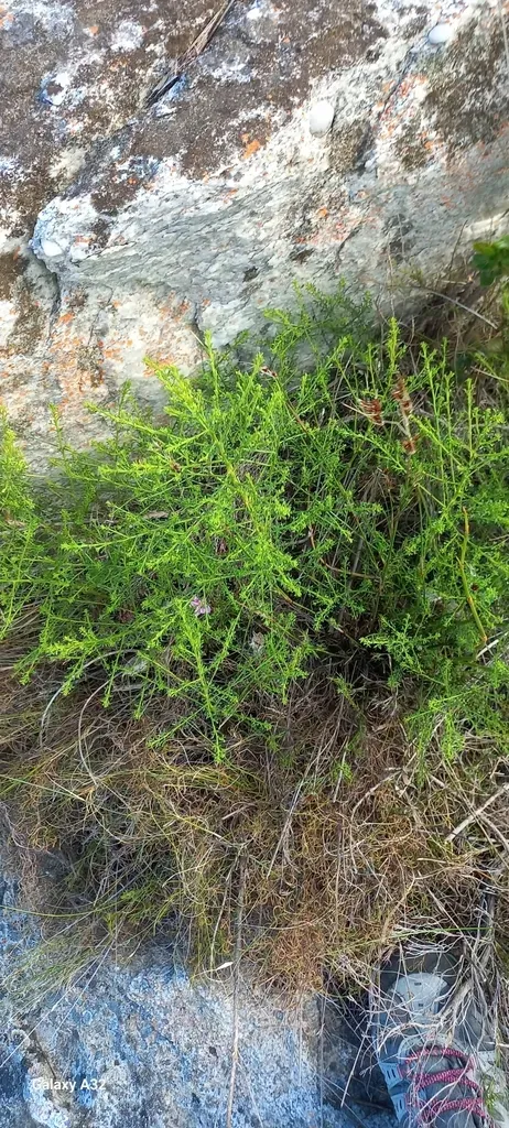 Psoralea aculeata is a resilient leguminous shrub native to South Africa, characterized by slender, thorny stems and trifoliate narrow leaves.