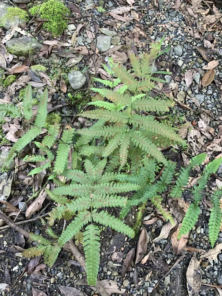 A terrestrial fern with erect, woody rhizomes and large, finely divided fronds.