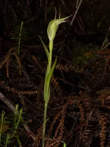 Pterostylis montana is a species of greenhood orchid endemic to New Zealand, characterized by erect, linear leaves and a single flower on the flowering stem.