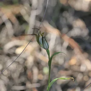 Pterostylis recurva is a tuberous, perennial orchid native to southwestern Australia, known for its distinctive jug-shaped flowers with green, white, and brown markings.