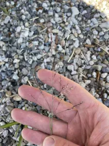 Puccinellia distans is a perennial grass-like herb known for its salt tolerance and adaptability to saline soils, commonly found along roadsides and wet disturbed soils.