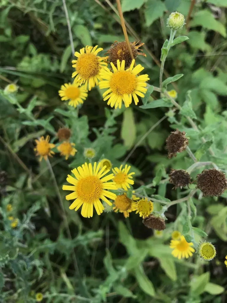 Pulicaria dysenterica is a perennial herbaceous plant in the Asteraceae family, known for its bright yellow, daisy-like flowers and its traditional use in treating dysentery.