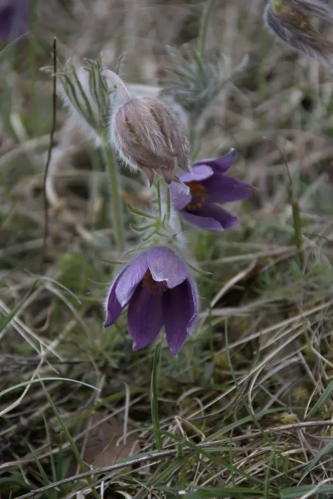 Pulsatilla vulgaris, known as Pasque Flower, is an early-blooming perennial herb native to calcareous grasslands of Europe, notable for its large, bell-shaped flowers and finely divided hairy foliage.