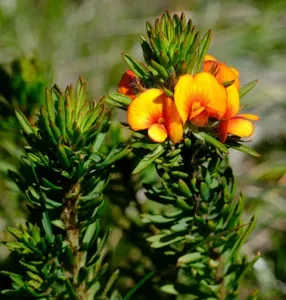 Dwarf Bush-pea (Pultenaea Humilis) is a perennial shrub in the Fabaceae family with moderate care difficulty. It requires moderate watering and full sun or partial shade light in USDA hardiness zones 9-11. This plant is safe for cats and dogs.