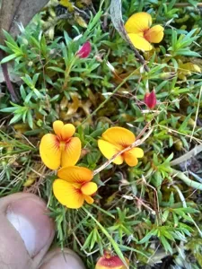 A prostrate, mat-forming native Australian shrub with bright yellow and brick-red pea flowers.