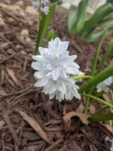 Puschkinia scilloides is a small bulbous perennial plant known for its early spring pale blue flowers with a distinctive darker blue stripe on each tepal.