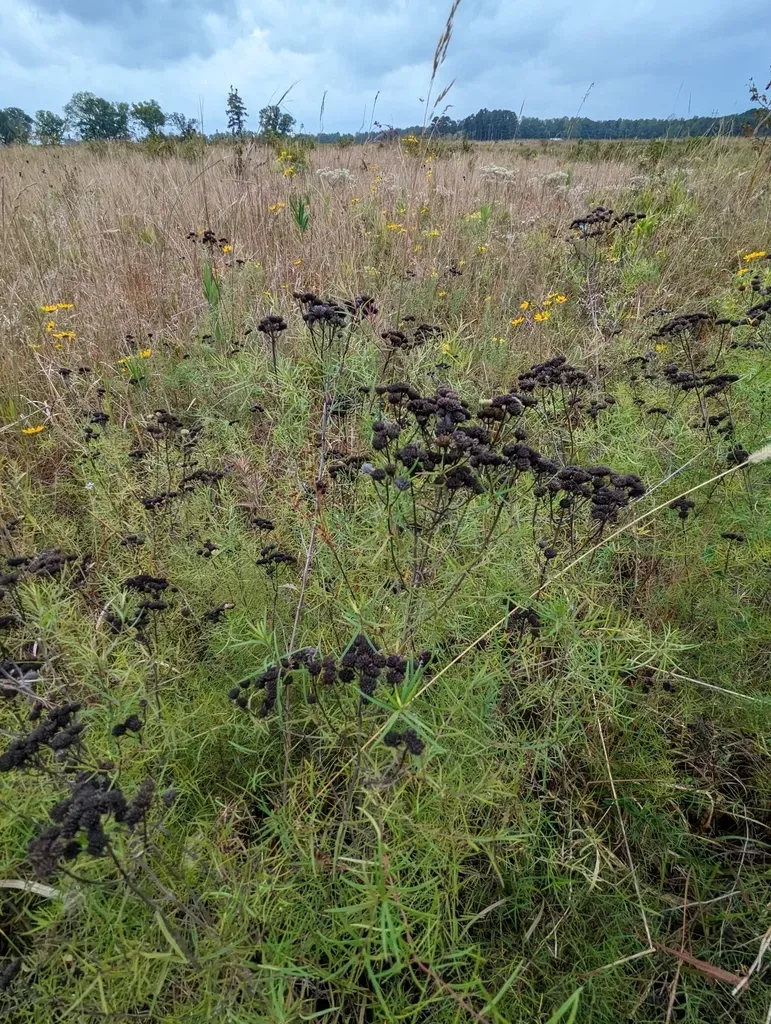 Pycnanthemum tenuifolium is a perennial herbaceous plant in the mint family, known for its narrow leaves and clusters of white flowers with faint lavender spots.