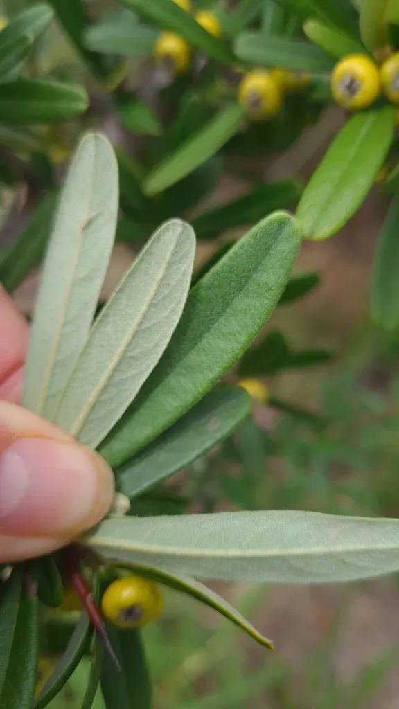 Pyracantha angustifolia is a dense, upright evergreen shrub or small tree known for its thorny branches and bright red berries.