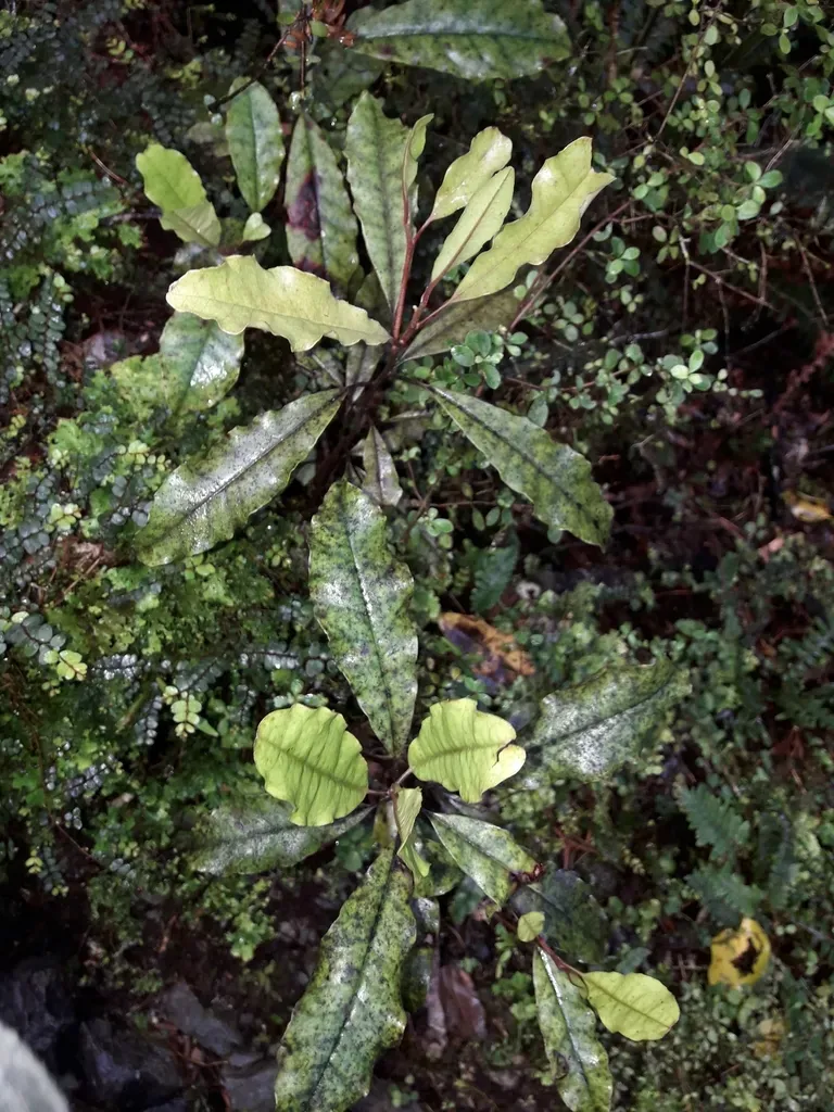 Quintinia serrata is an evergreen tree species endemic to New Zealand, known for its spotted twigs and wavy, purple-spotted leaves.