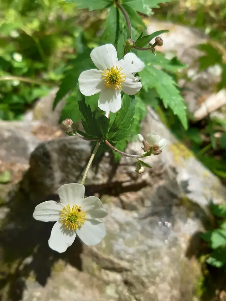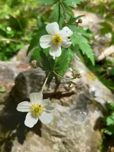 A perennial herbaceous plant with white double flowers, native to Central Europe, known for its attractive foliage and clump-forming habit.