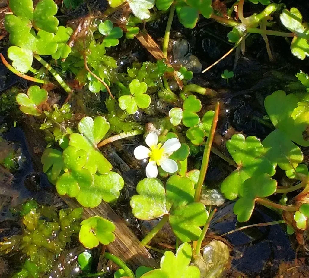 Ranunculus omiophyllus is a creeping hydrosubshrub commonly found in shallow water or wet soil environments such as pond margins and ditches.