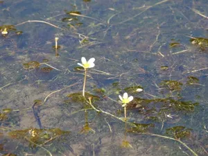 Ranunculus trichophyllus is a herbaceous aquatic plant found in slow flowing streams, ponds, and lakes, characterized by white daisy-like flowers with yellow centers.