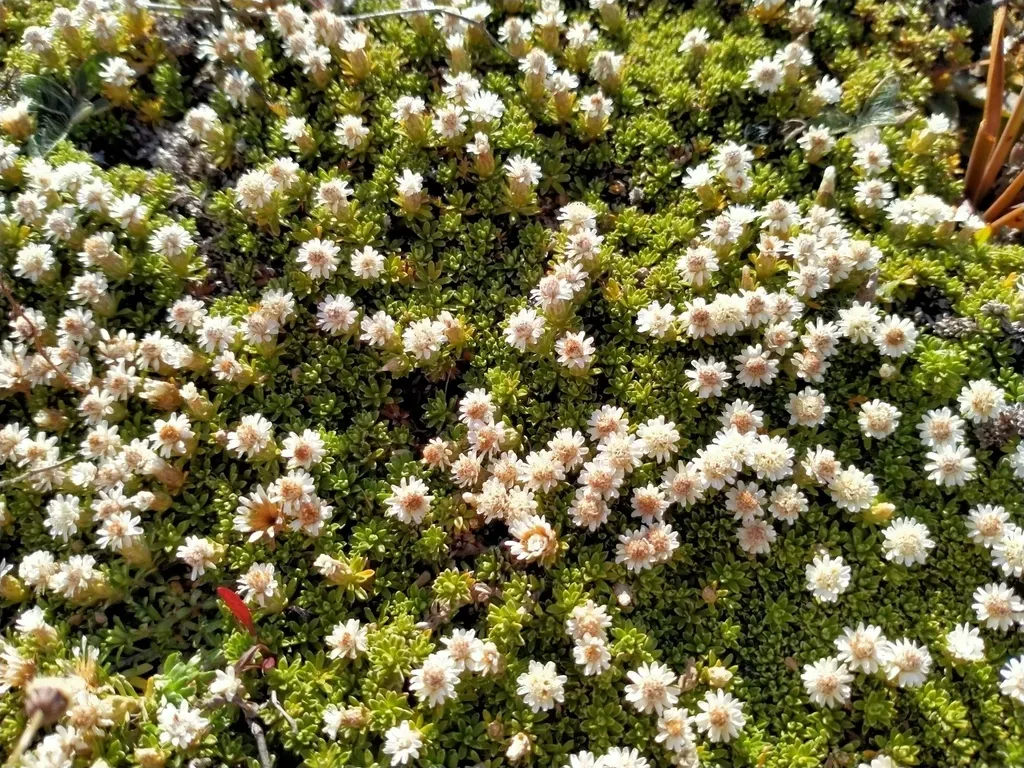 Raoulia subsericea is a mat-forming, evergreen perennial plant native to New Zealand with tiny, overlapping, lightly hairy, grey-green leaves and white flower heads during summer.