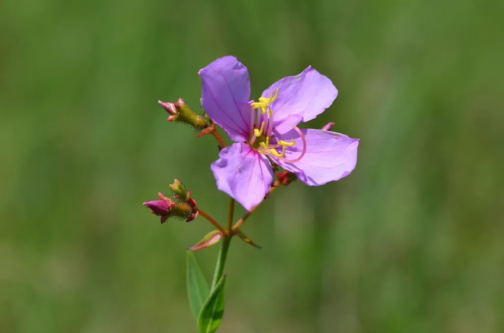 Rhexia alifanus is a perennial herbaceous plant known for its elegant pink flowers with curved yellow stamens and reddish urn-shaped seed capsules.