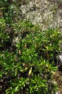 Rhododendron aureum is a dwarf evergreen shrub known for its yellow to cream-colored flowers and creeping growth habit.