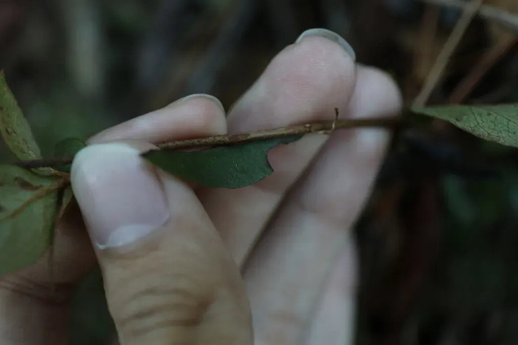 Rhododendron breviperulatum is an evergreen azalea species characterized by densely-branched shrubs with a low spreading habit and ovate-elliptic leaves.