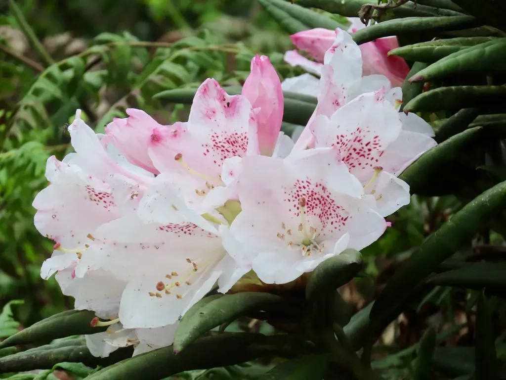 Rhododendron pseudochrysanthum is a broadleaf evergreen shrub known for its attractive white to pale pink flowers, often spotted with red, and striking foliage.